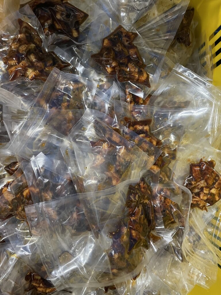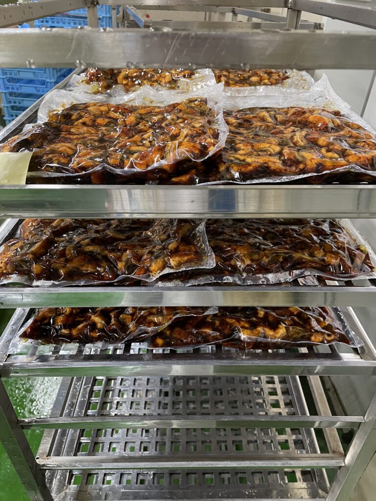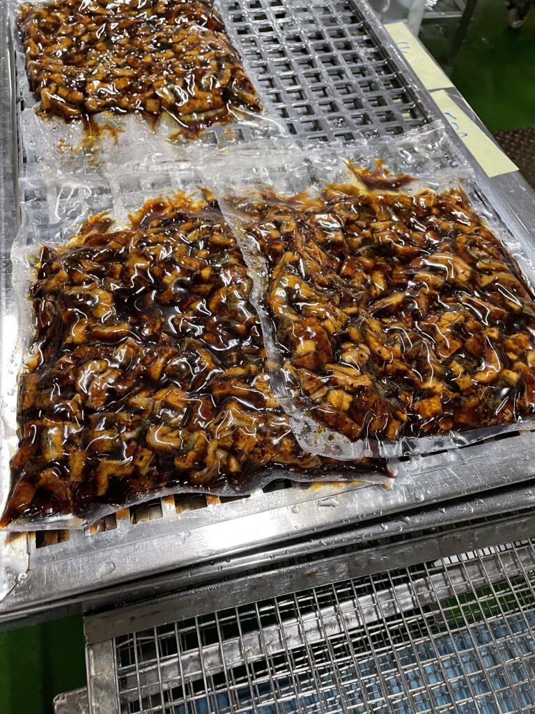 業務用のうなぎ蒲焼きざみ真空パックを作っています。