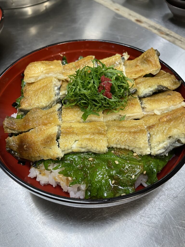白焼き丼。しかも、ソースを大葉にかけ、白焼きの風味と大葉のさわやかさ、そしてごま油を混ぜて作った