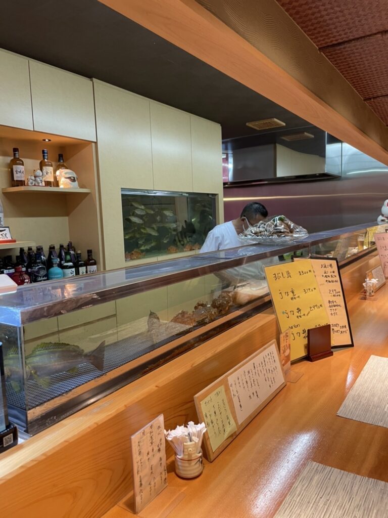 カウンターにはネタケース。が、活魚、貝類、エビ類が生きています。