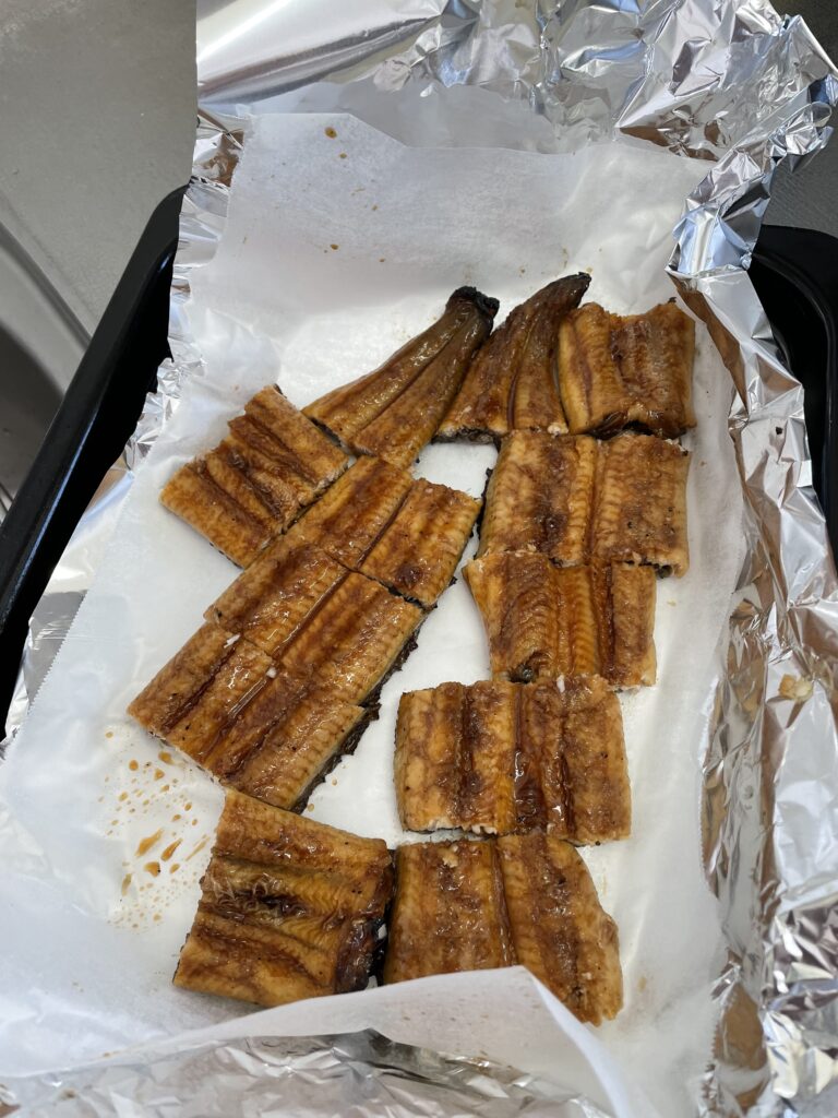 一口大に蒲焼を切って、クッキングシートの上に乗せる。