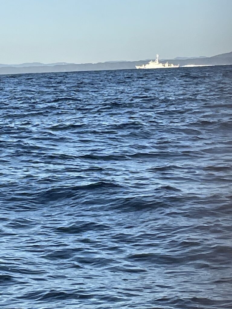 写真だと遠いが、海上保安庁巡視艇が並走している。