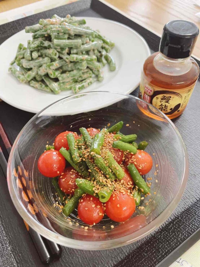 奥のインゲンは、茹でて、胡麻ドレッシングを和えて作ったインゲンサラダ。