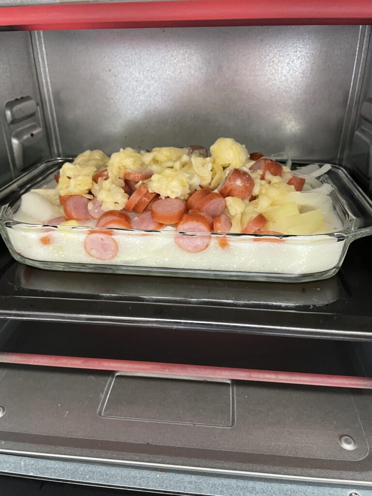 ソーセージ、玉ねぎ、ジャガイモ(下茹でする)を耐熱皿に入れ